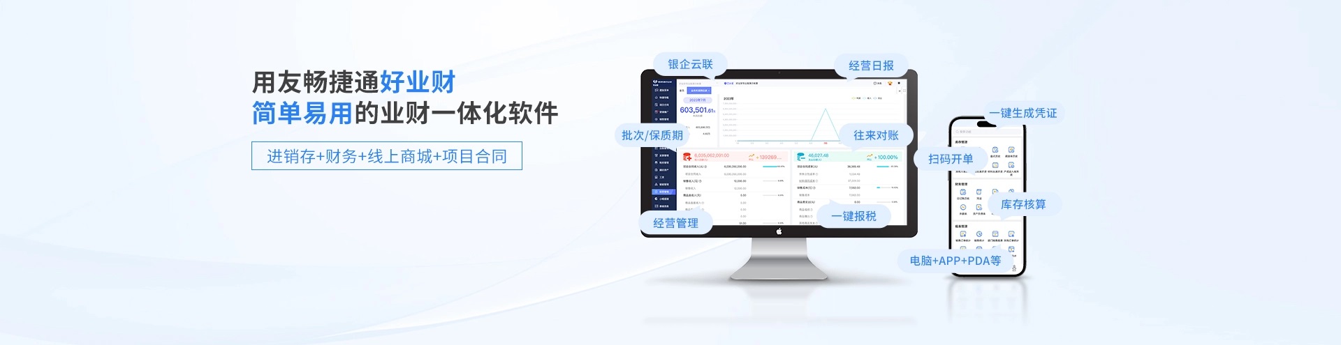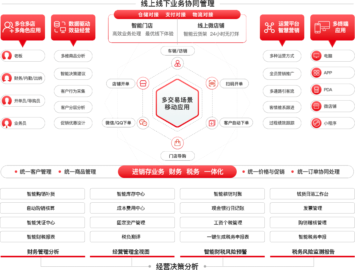 涵蓋了采購管理、銷售管理、庫存管理、線上商城、項目合同管理、財務管理、稅務管理、發票管理等功能特性